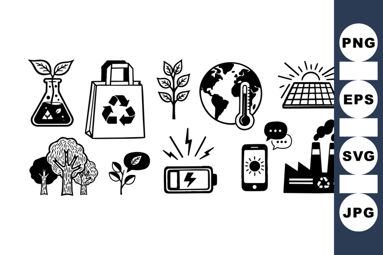 Climate Change Icons Solar Panel Clipart Sustainable Power Icons Factory Pollution Graphic Green Energy Symbols Eco Energy Icons Recycle Bag Vector Battery Charge Graphic Environmental Design Set Tree Nature Illustrations