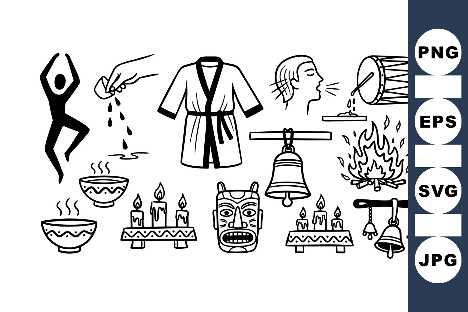 A collection of black and white vector icons showing ritual altar elements including a dancing figure, pouring liquid, robe, singing face, drum, fire, and candles in line art style, conveying a spiritual and ceremonial mood.
