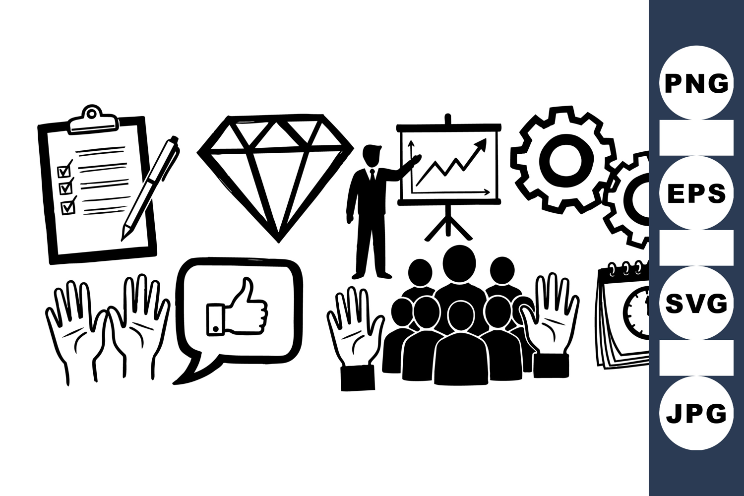 A set of black and white vector icons depicting business concepts such as checklist, diamond, presentation, gears, audience with raised hands, thumbs up speech bubble, and clock calendar in a clean line art style