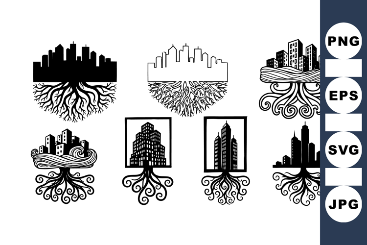 City Skyline Vector Modern Cityscape Art Black White Vector Tree Roots Illustration Urban Roots Design Building Silhouette Set Urban Vector Pack Cityscape Vector Bundle Architecture Clipart Set Root Design Graphics