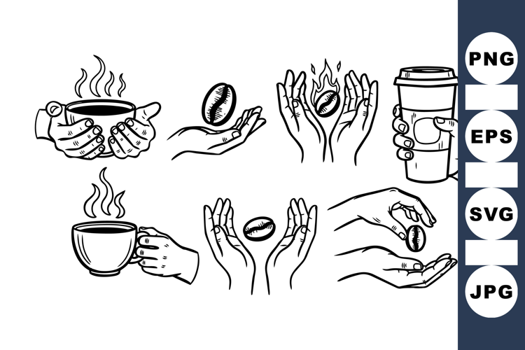 Hand drawn line art features hands holding steaming coffee cups and coffee beans in dynamic gestures. suitable for branding, cafes, and coffee related design, vintage style.