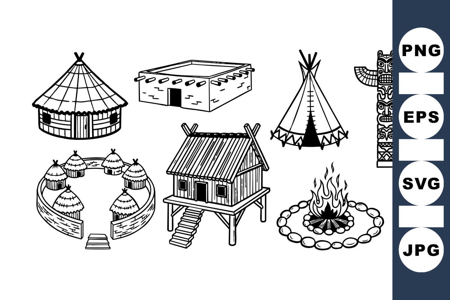Indigenous Art Pack Black Outline Set Campfire Clipart Set Tribal Village Clipart Native Home Bundle Tribal Hut Illustrations Totem Pole Graphics Primitive Building Design Ethnic Home Bundle Traditional Village Set