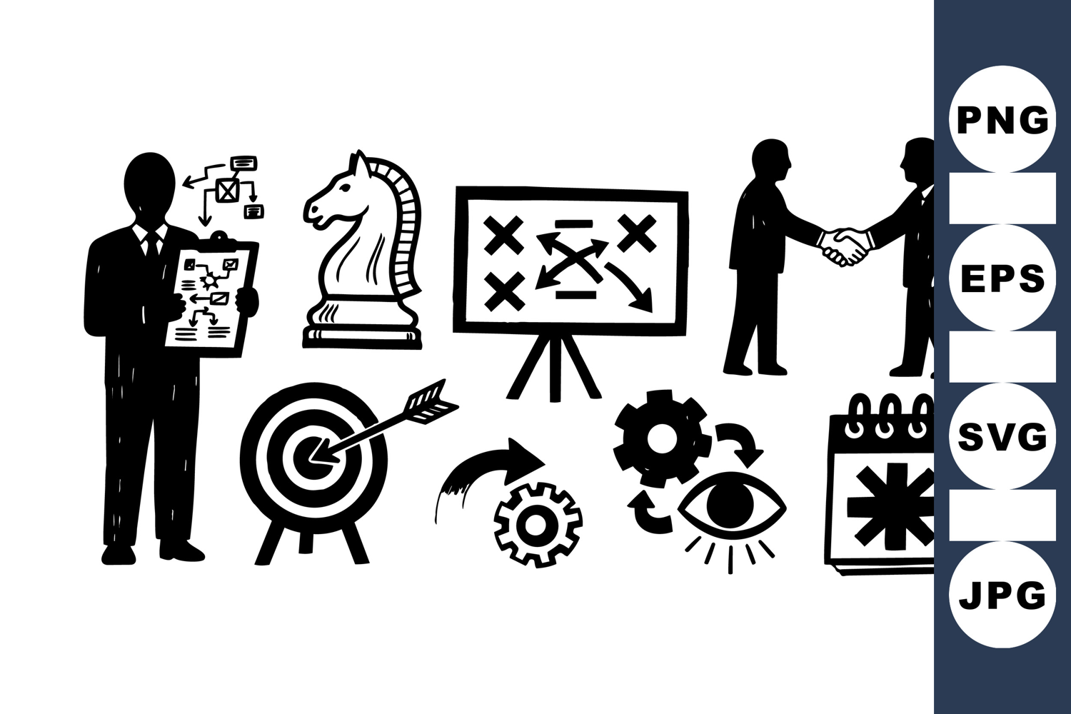 Black silhouette icons depict business planning and strategy with symbols like chess knight, target with arrow, handshake, calendar, and teamwork gears in minimalist style.