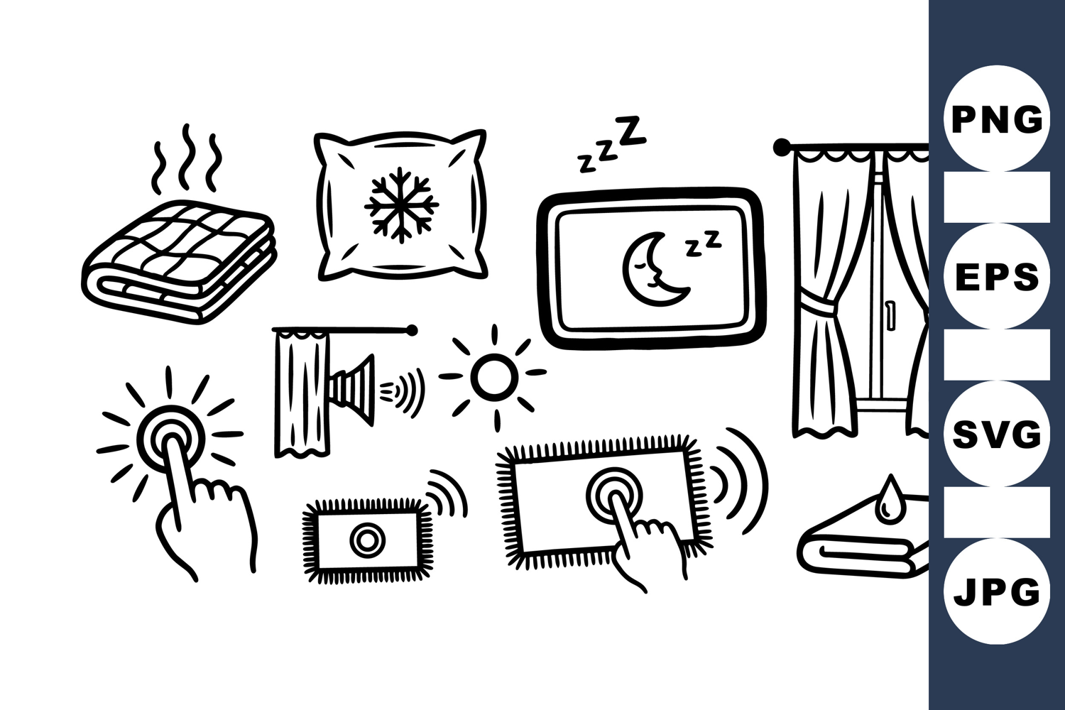A collection of simple black ink line art icons illustrating smart home functions like temperature control, window curtains, touchscreen panels, and sound adjustment for modern living.