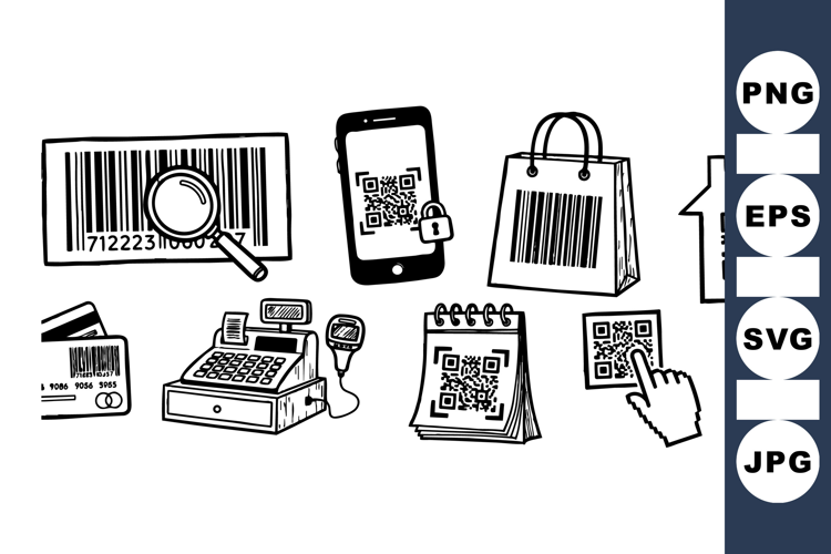 Shopping Bag Clipart Mobile Payment Icon Hand Drawn Barcode Qr Code Vector Checkout Register Graphic Retail Store Set Cash Register Vector Security Qr Code Credit Card Art Product Scanning Design