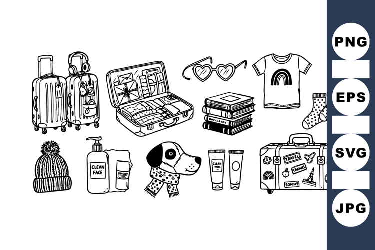 Hand Drawn Clipart Black And White Art Line Art Illustrations Summer Travel Design Travel Adventure Graphics Travel Essentials Bundle Vacation Packing Set Dog And Scarf Clipart Suitcase Sticker Art Casual Wear Graphics