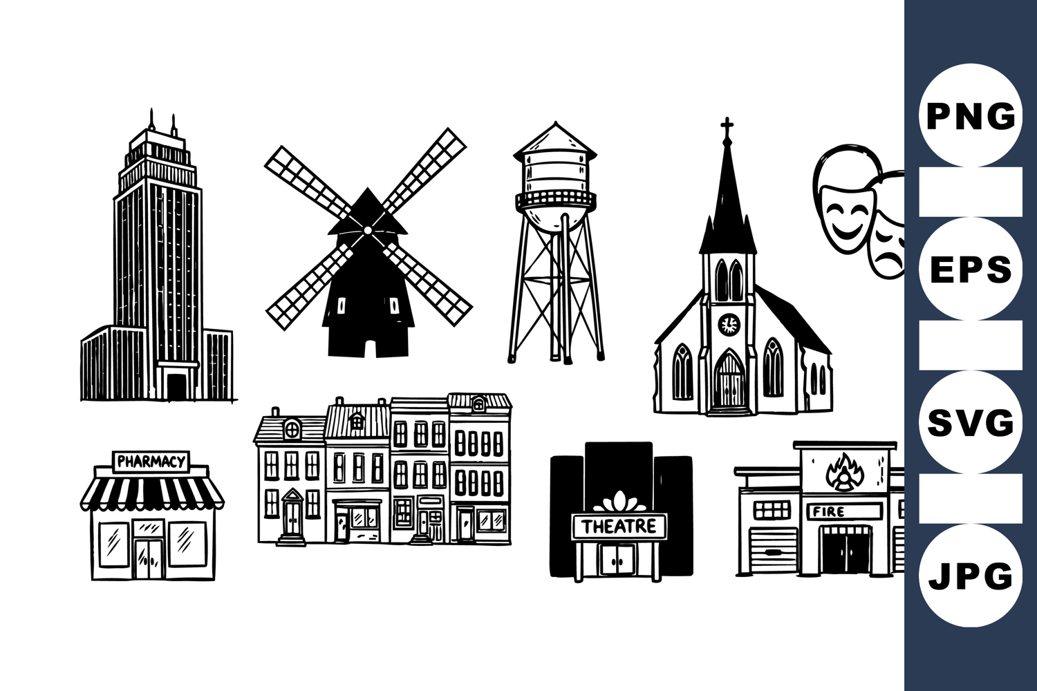 Vintage Cityscape Clipart Urban Building Vector Retro Town Illustrations Historic Architecture Set Line Art City Buildings Theatre Building Graphic Pharmacy Storefront Design Fire Station Clipart Set Windmill Vector Pack Church Landmark Illustration