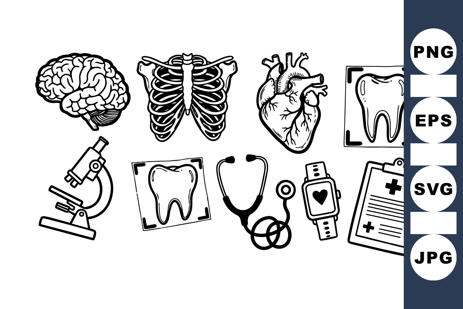 Monochrome vector art displaying detailed medical icons including brain, ribcage, heart, microscope, dental images, stethoscope, watch, and clipboard in line style, clean and precise.