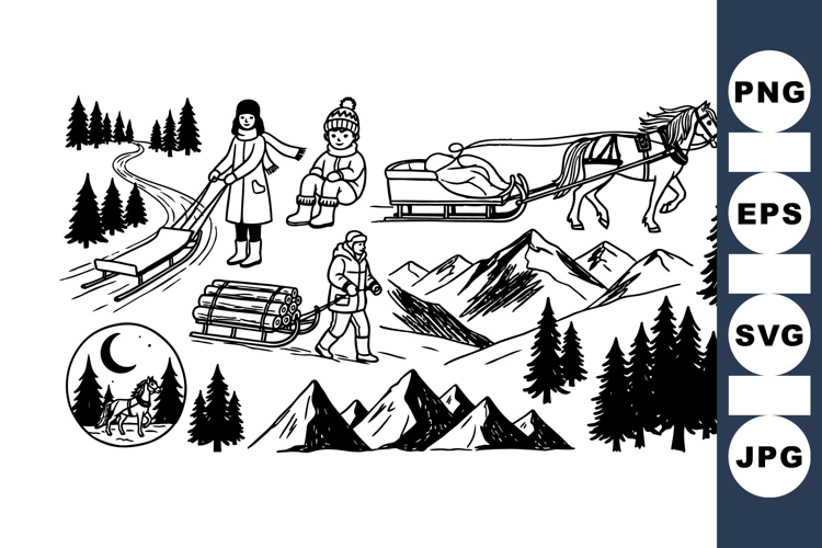 Winter Forest Clipart Black White Clipart Snowy Landscape Clipart Winter Adventure Set Winter Activity Illustrations Vintage Mountain Illustration Horse Sled Vector Winter Nature Bundle Rustic Winter Graphics Outline Winter Elements