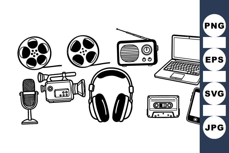 Monochrome vector collection of retro and modern media equipment including microphone, camera, radio, headphones, cassette, laptop, and smartphone, showcasing diverse communication devices.