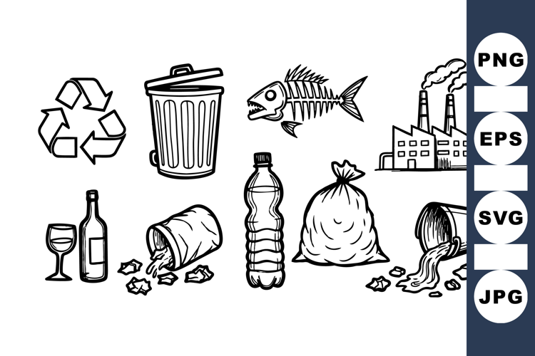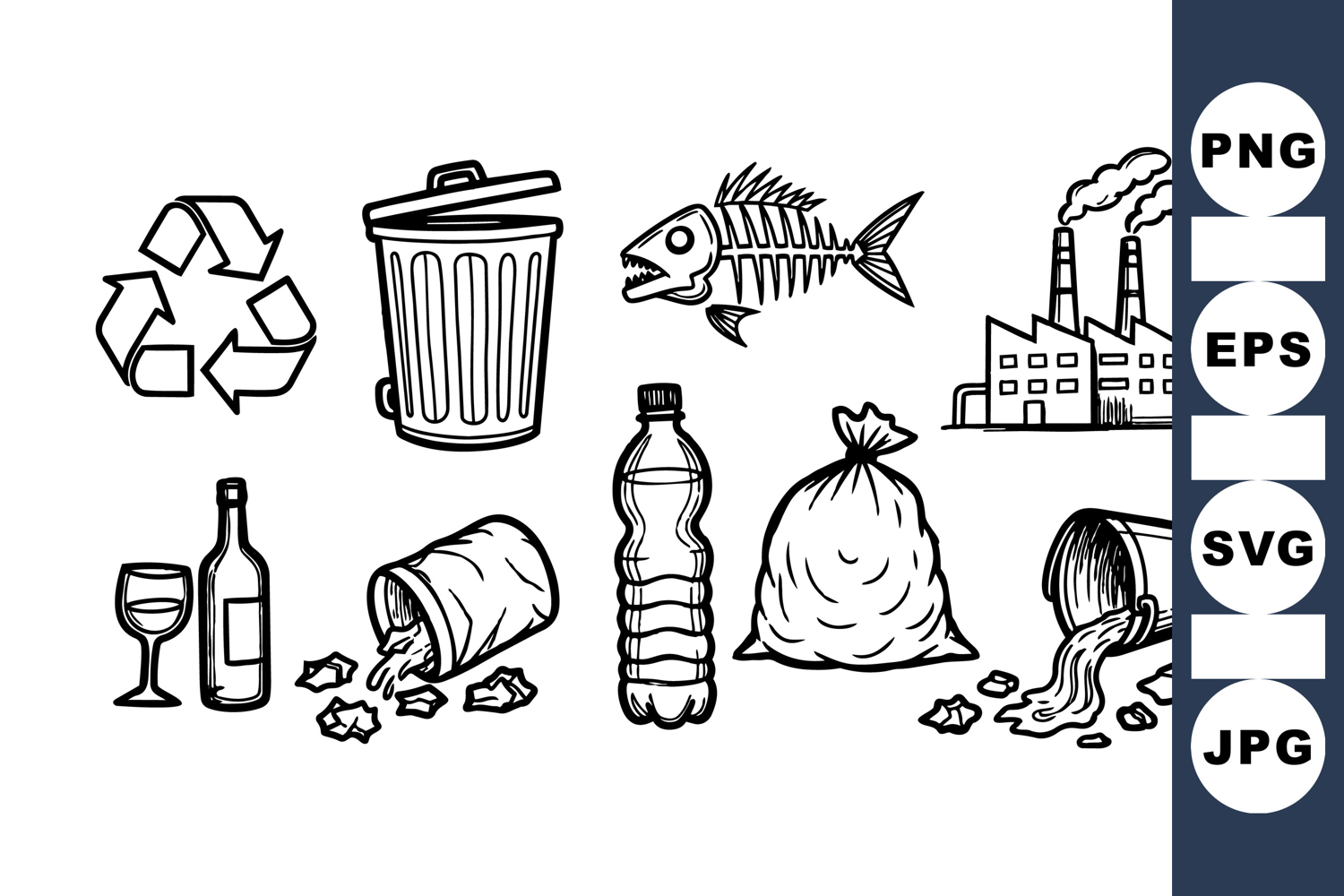 Waste Management Icons Recycling Symbol Clipart Garbage Bin Illustration Plastic Bottle Vector Environmental Pollution Art Factory Smoke Drawing Fish Skeleton Graphic Trash Bag Cartoon Eco Friendly Vector Hand Drawn Trash