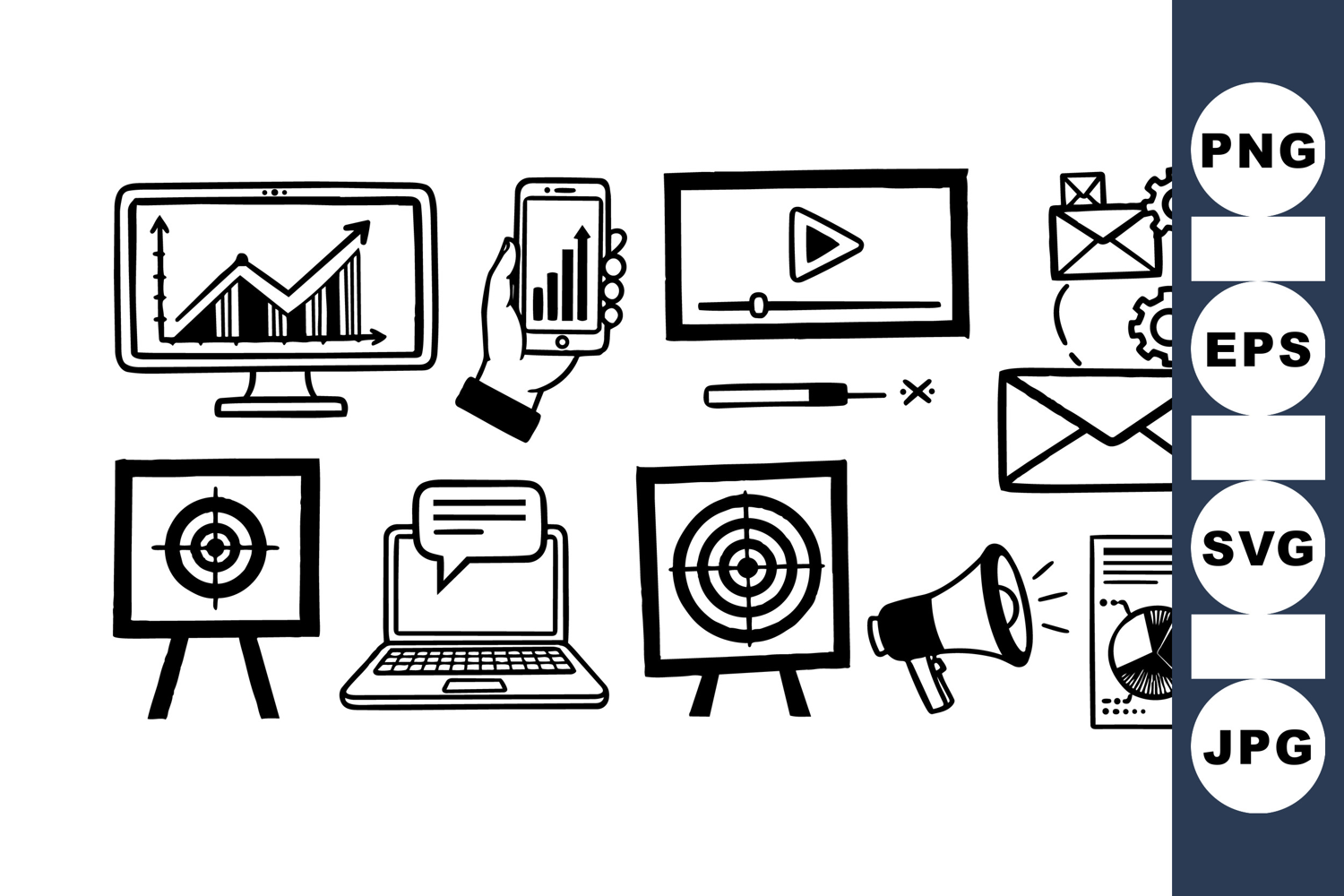 Hand drawn linear black and white digital marketing icons include charts emails video player targets megaphone and laptop with chat bubble delivering clear communication concept in minimalist style