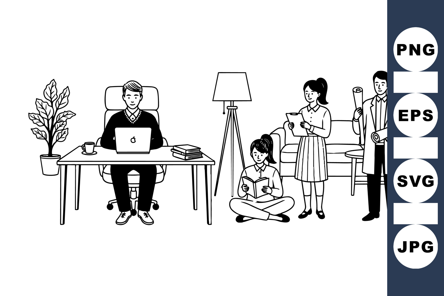 Black and white line art depicts a man working on a laptop, two women reading documents and a man with blueprints by a couch and lamp, peaceful office scene.