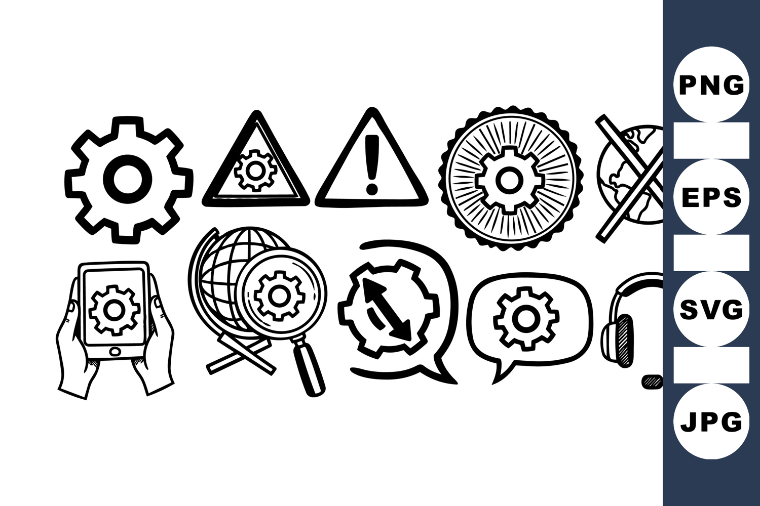 A hand drawn style vector icon collection includes gear symbols, mobile device, headset, globe with cross, magnifying glass, and warning signs in monochrome outline style.