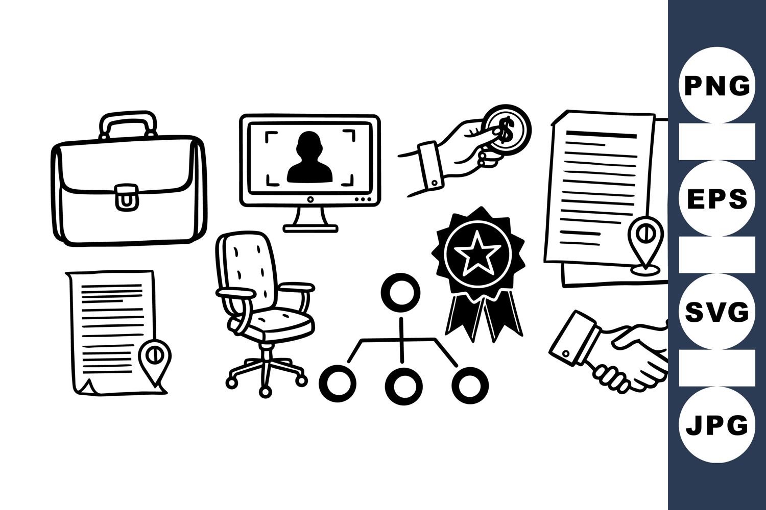 A collection of hand sketched business icons including briefcase, office chair, computer profile, coin, documents with location pins, award badge, organization diagram, and handshake illustration, showcasing minimalist design and professional mood.