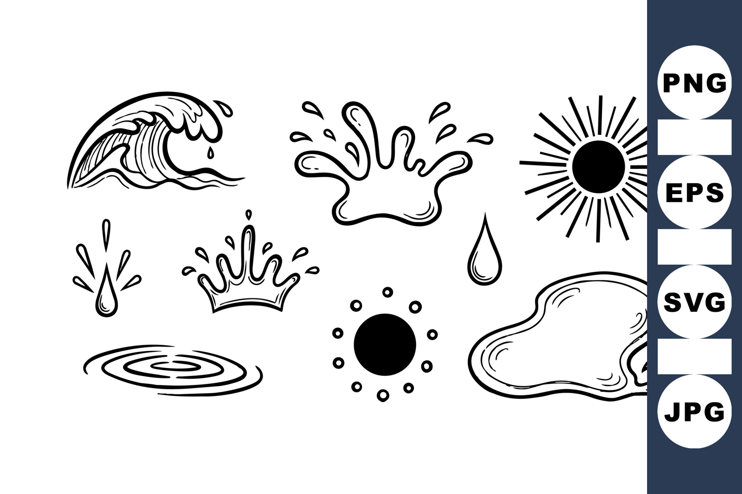 Water Splash Clipart Black White Vector Wave Vector Design Sun Icon Clipart Liquid Droplet Art Fluid Splash Graphics Outline Water Symbols Water Ripple Set Droplet Clipart Bundle Summer Water Graphics
