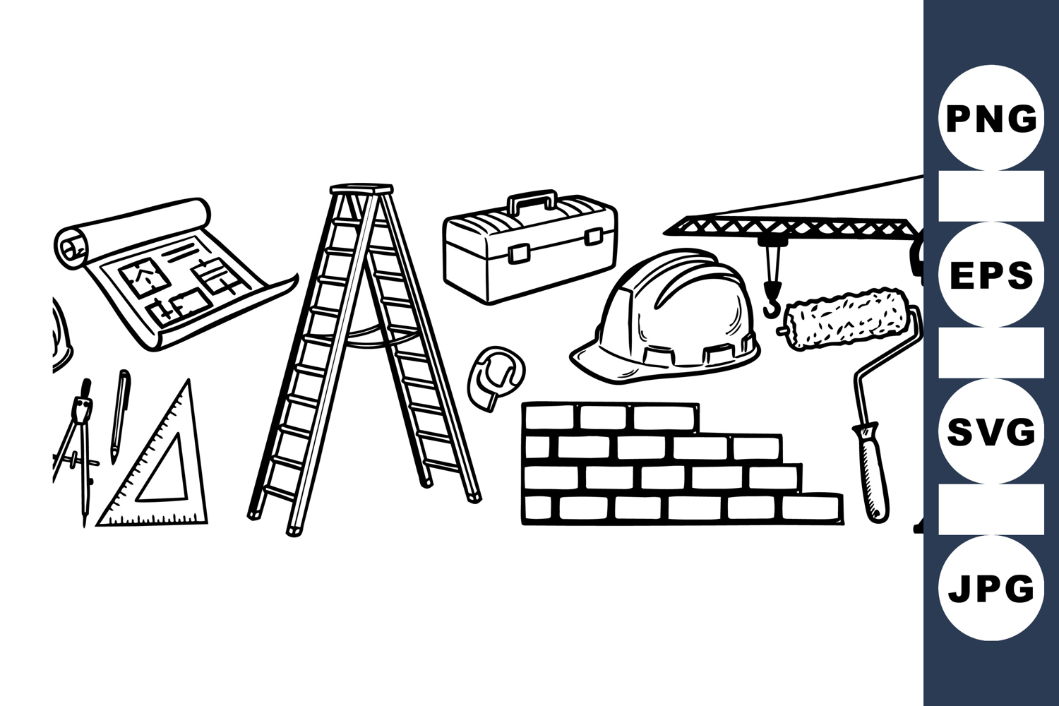 A collection of hand drawn construction tools and equipment including ladder, hard hat, blueprint, bricks, roller, and crane in black and white line art style.