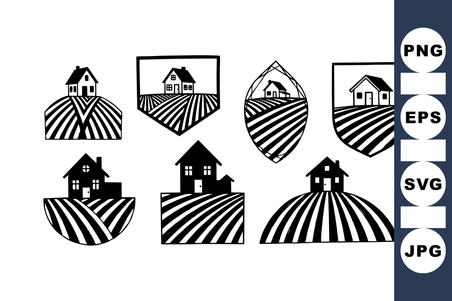 Set of seven monochrome vector farm house icons displayed on striped farmland backgrounds with shield and round badge shapes, simple flat design style
