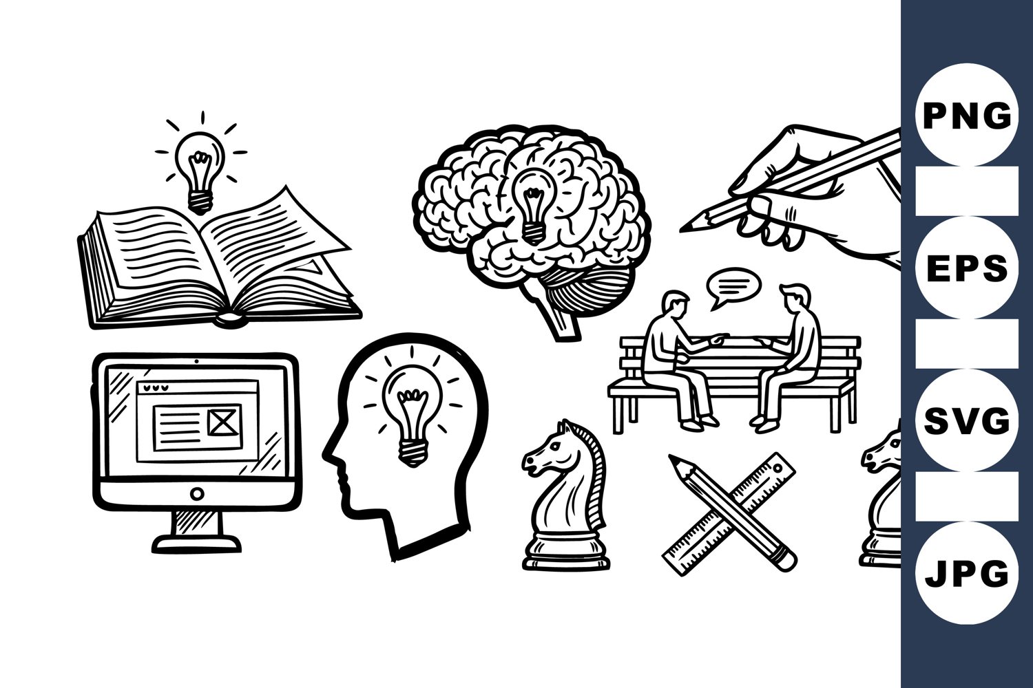 Hand Drawn Illustration Black And White Svg Business Meeting Clipart Educational Icon Set Creative Thinking Icons Brain Concept Graphics Idea Lightbulb Design Strategy Chess Pieces Computer Screen Vector Writing Pencil Drawing