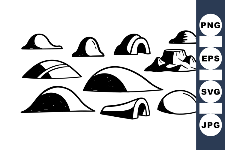 A set of black and white minimalist hand drawn rock and mountain shape sketches with varied forms, ideal for graphic design and natural themed projects, simplistic style.
