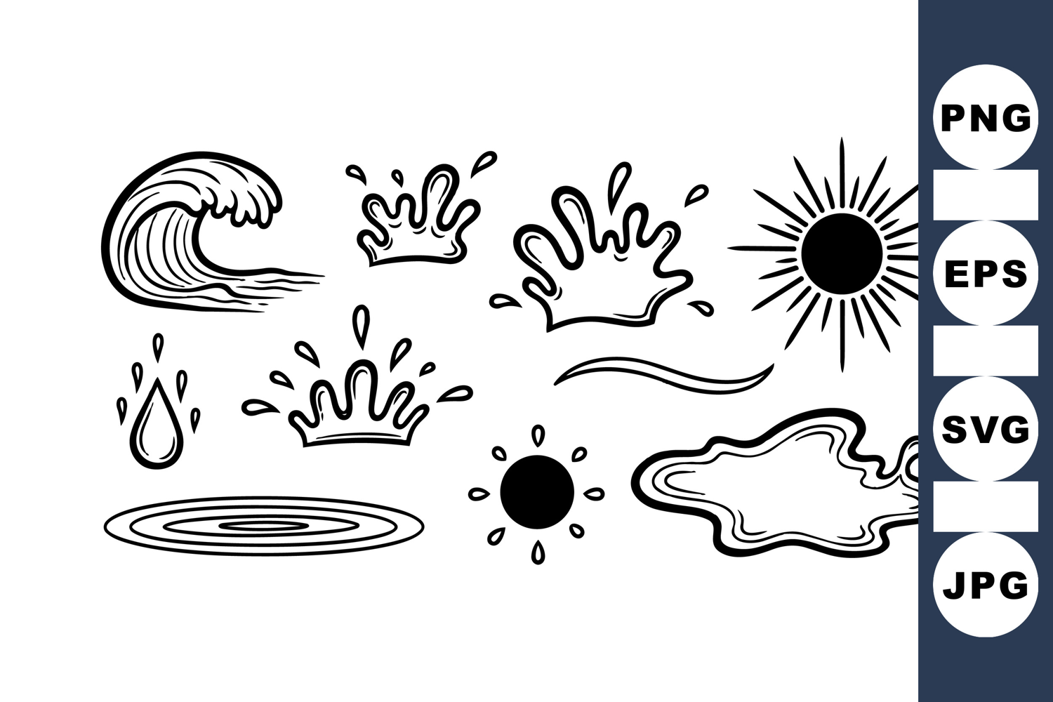 Hand Drawn Vector Nature Design Bundle Weather Icon Set Water Splash Clipart Minimalist Sun Icon Sun And Wave Design Summer Water Elements Black And White Splash Ocean Water Clipart Liquid Splash Pack