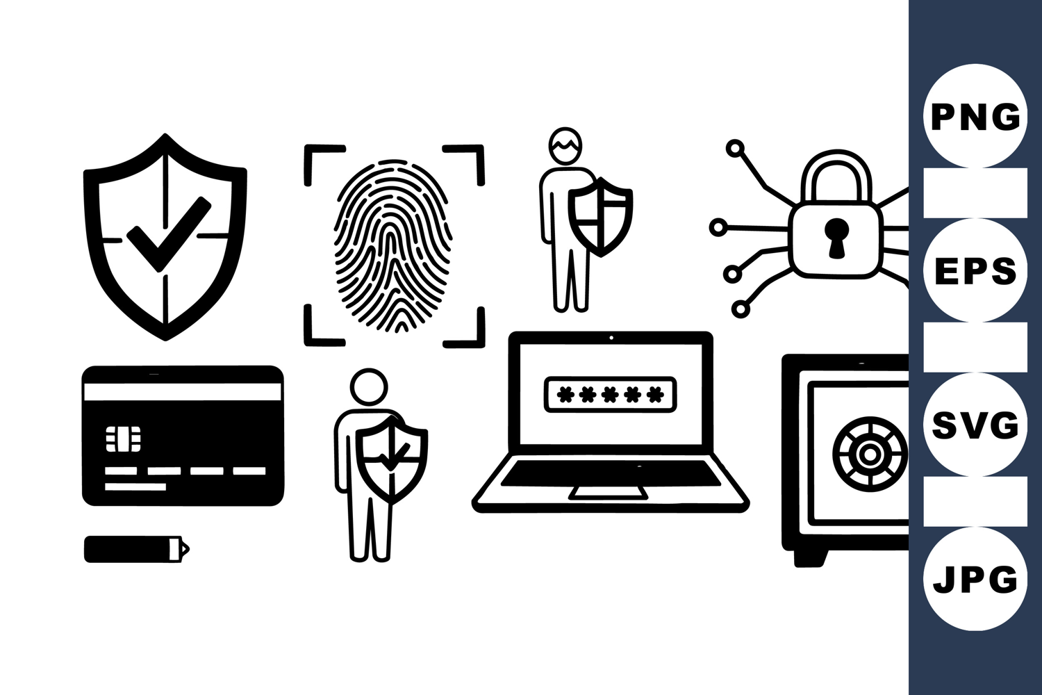 Collection of black and white cybersecurity vector icons featuring fingerprint scan, laptop password entry, shield protection, credit card security, and safe vault imagery, ideal for digital security themes and web design projects