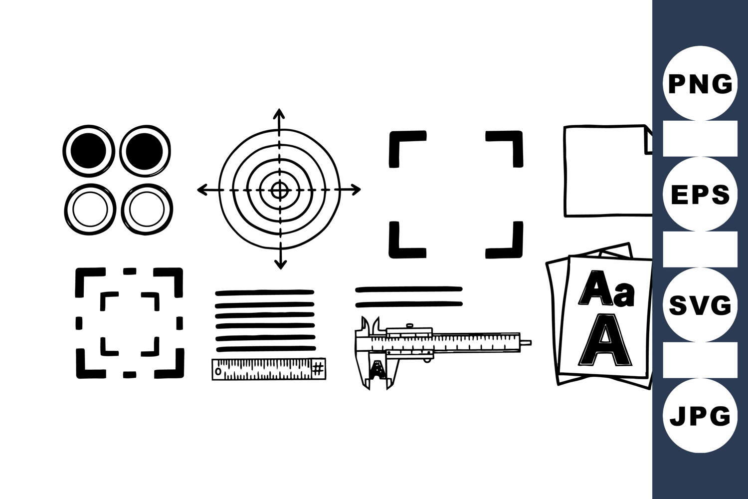 Set of hand drawn style precision measurement icons featuring targets, rulers, focus frames, typography sheets and calipers in monochrome vector art for creative projects.