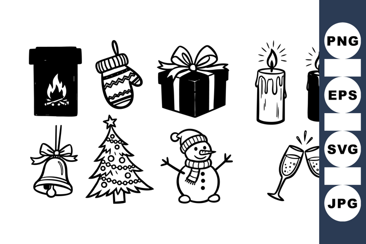 Collection of simple black and white christmas themed icons including snowman, bell, mittens, gift box, pine tree, candles, fireplace, and clinking champagne glasses, festive and minimalist.