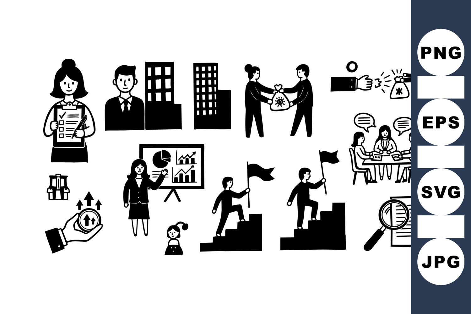 Monochrome vector set showing business professionals presenting reports, making deals, climbing stairs with flags, and collaborating in meetings, depicting growth and success concepts.