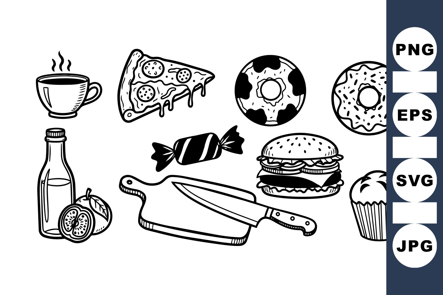 Hand drawn black and white vector featuring pizza slice, donuts, coffee cup, burger, cupcake, knife, lemon slice, and candy in a playful style.
