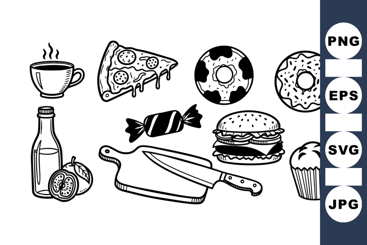 Black And White Clipart Food Icon Set Fast Food Illustrations Dessert Clipart Set Hand Drawn Food Meal Icon Collection Snack Clipart Pack Kitchen Utensil Graphics Cooking Vector Bundle Minimalist Food Bundle