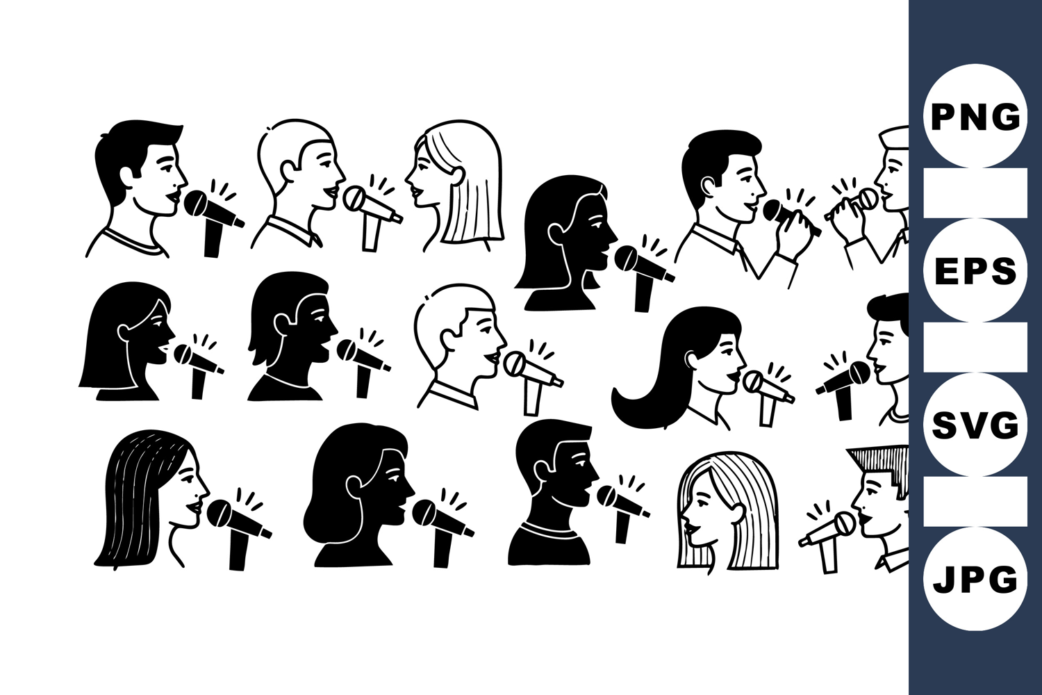 A collection of black and white vector icons showing men and women singing into microphones, featuring varied hairstyles and profile views, in minimalistic style.