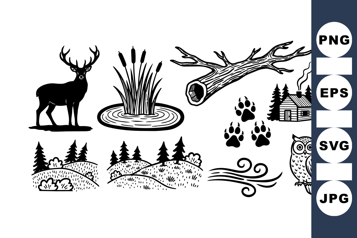 A collection of black and white forest wildlife vectors featuring deer, owl, marsh plants, paw prints, and cabin in peaceful rustic style.