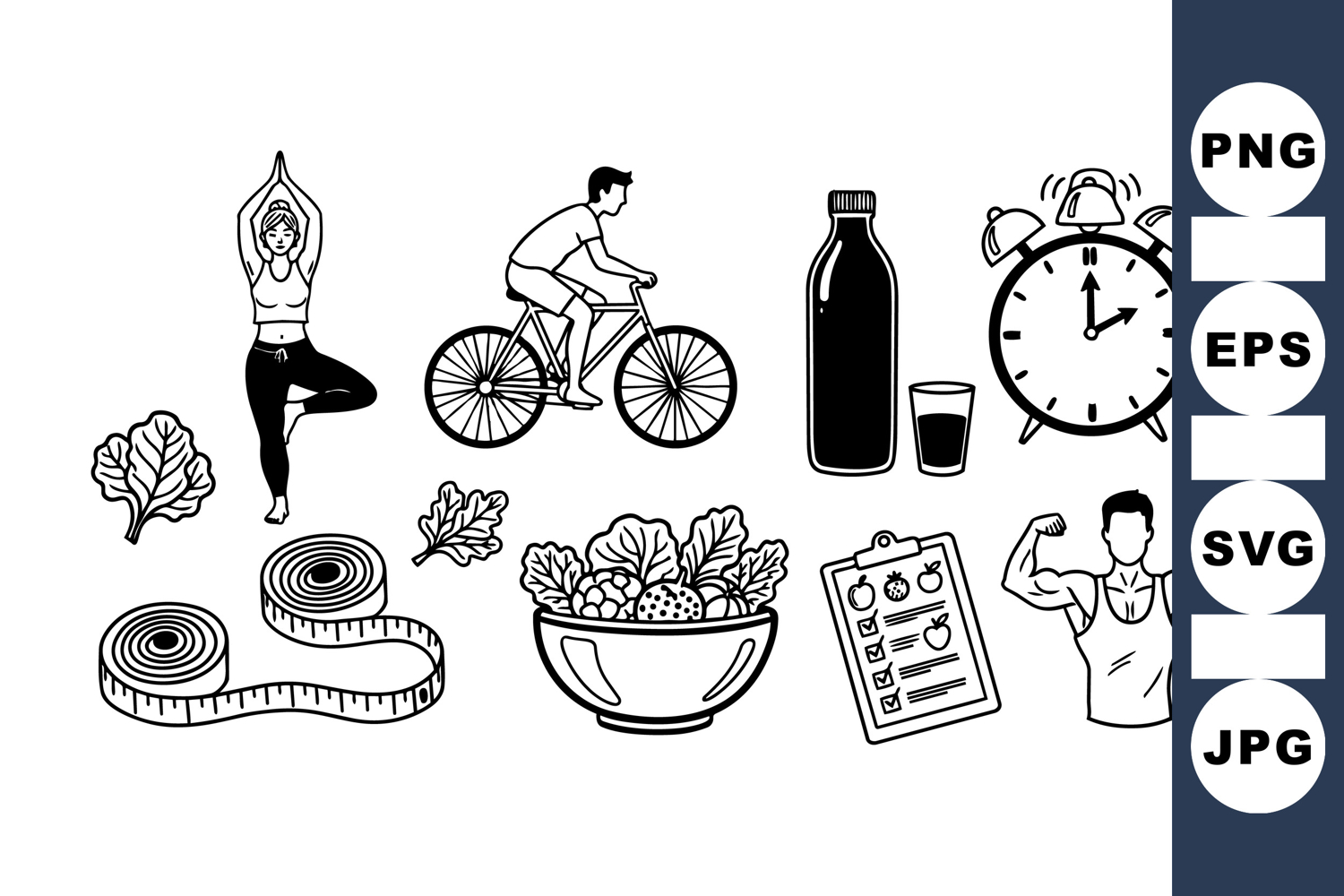 Simple black and white vector line art featuring yoga, cycling, salad, fitness tracking, and muscle flexing icons representing health and wellness lifestyle concepts.