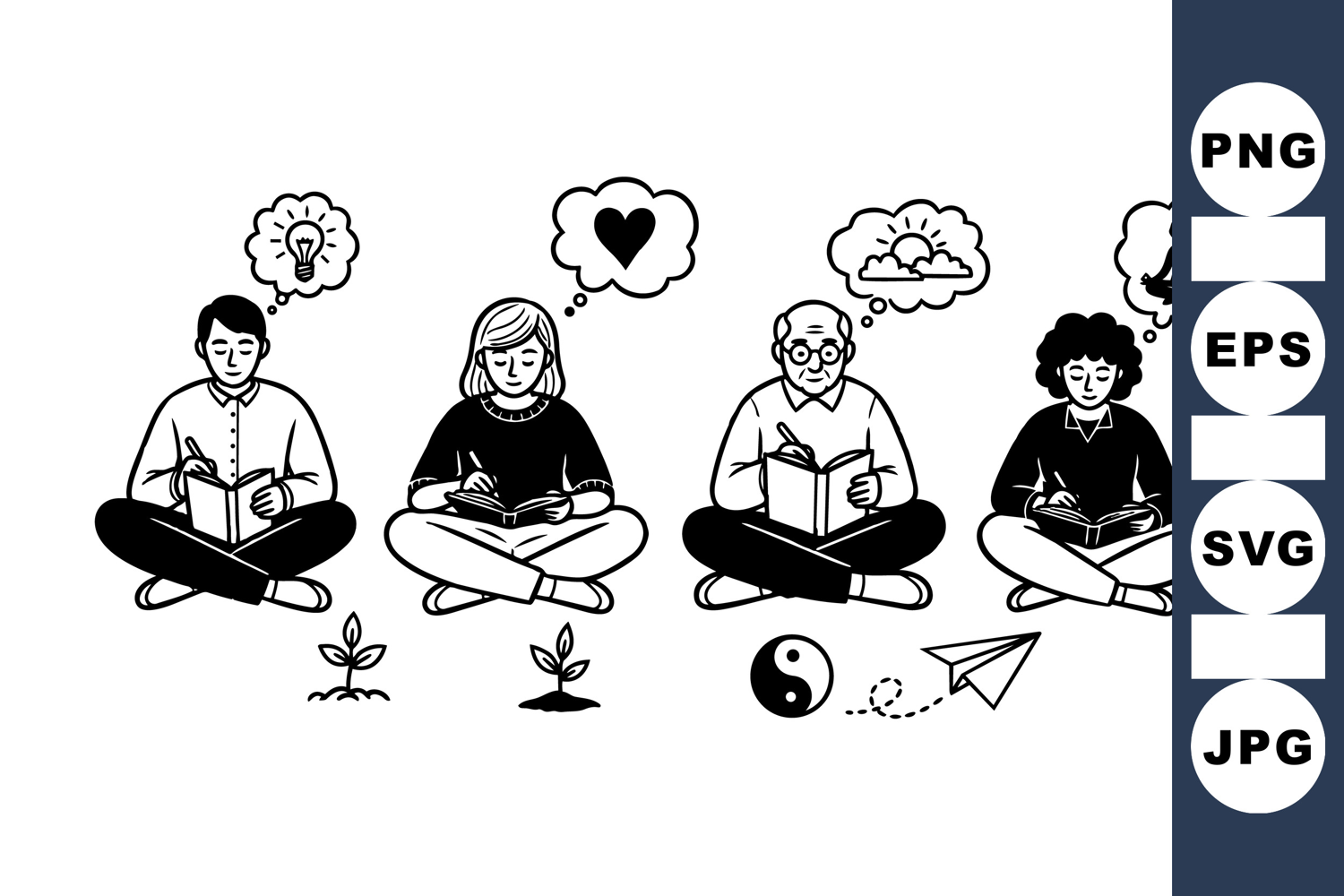 Black and white line art illustration showing diverse individuals sitting cross legged and writing in notebooks, each with a unique thought bubble representing ideas, love, nature, and mindfulness, conveying creativity and meditation.