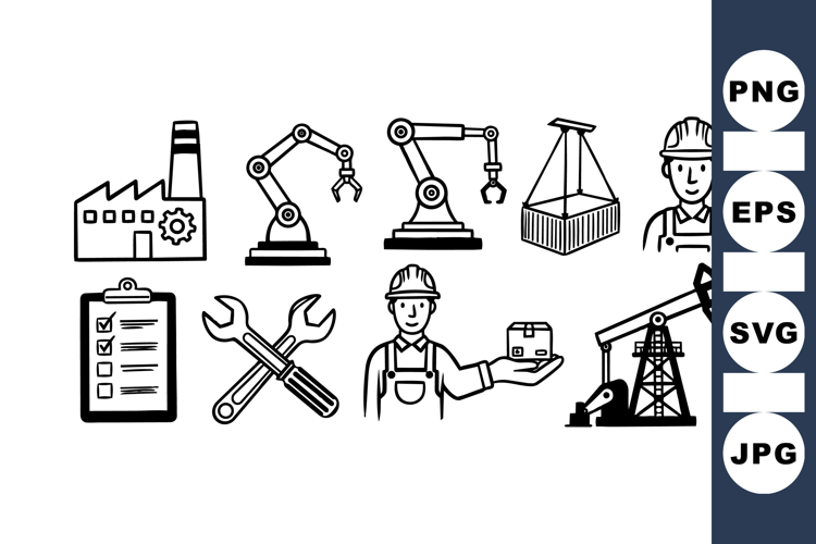 Construction Worker Svg Oil Rig Illustration Factory Machine Clipart Robotic Arm Graphics Mechanical Tool Set Industrial Worker Icons Assembly Line Icons Equipment Maintenance Graphics Worker With Package Svg Production Checklist Svg
