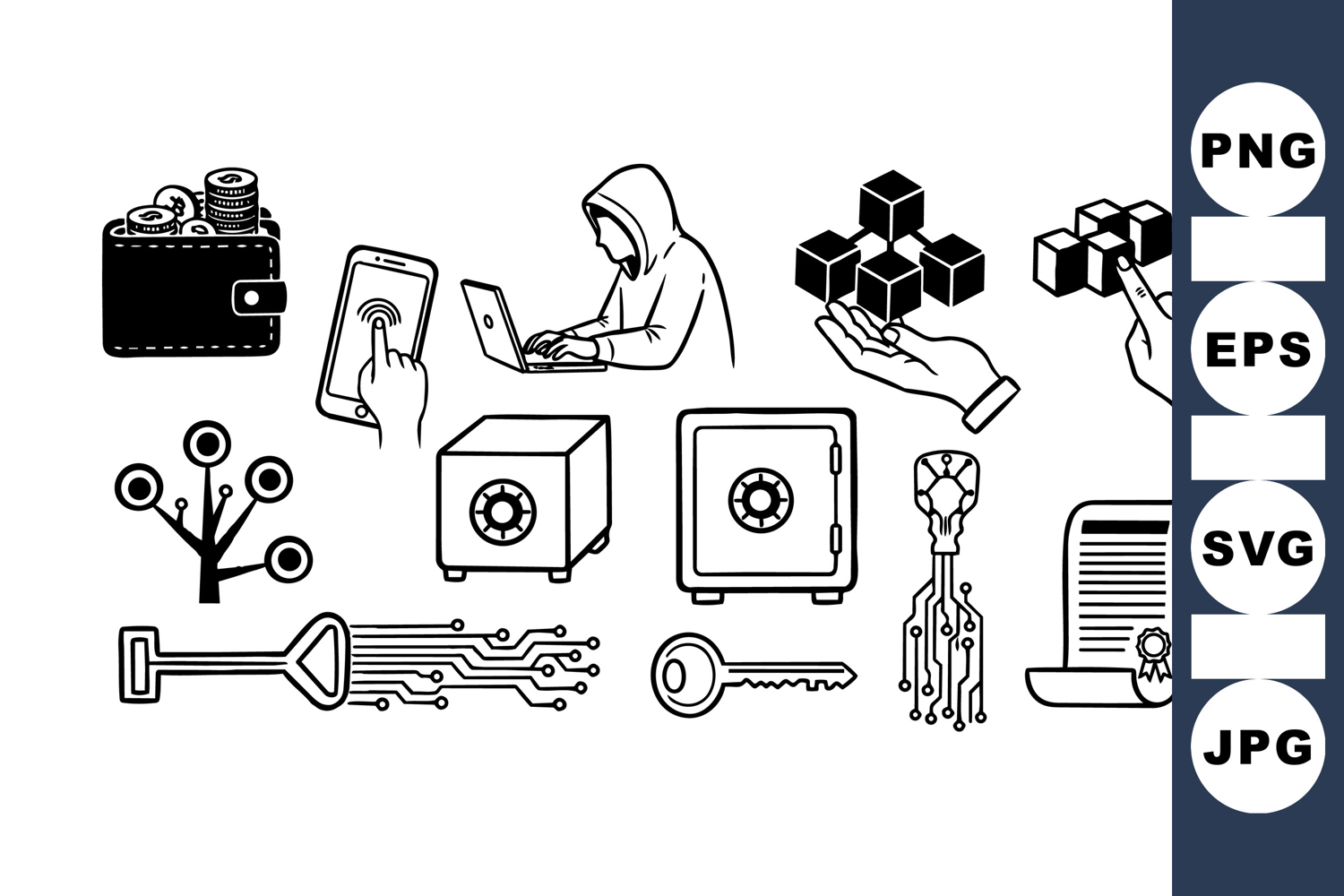 Collection of black and white vector icons showing cybersecurity, blockchain technology, digital wallet, hacker at work, and data encryption concepts in minimalist style.