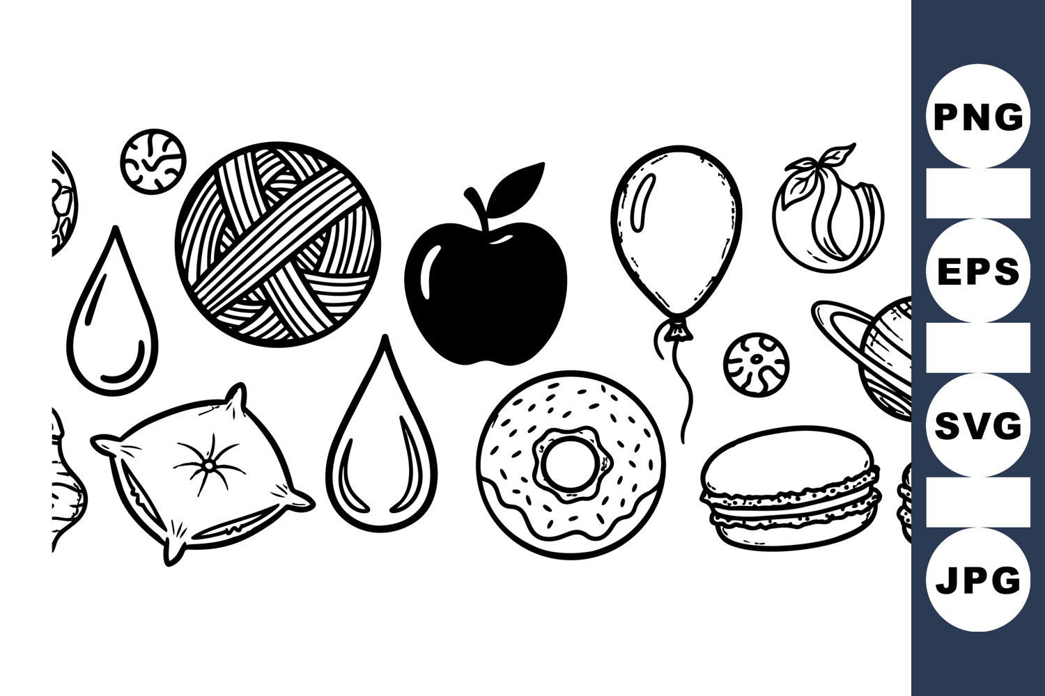 Seamless black line vector pattern featuring yarn ball, pillow, water drops, apple, balloon, donut, macarons, and planet icons in a hand drawn style, playful and artistic