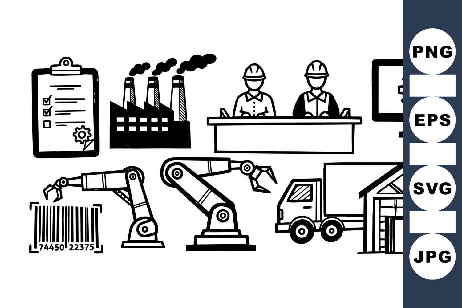 Robotic Arm Clipart Industrial Manufacturing Icons Factory Assembly Line Production Plant Graphics Logistics And Warehouse Engineer Workspace Design Automation Process Clipart Assembly Line Bundle Barcode Scanning Icons Manufacturing Equipment Pack