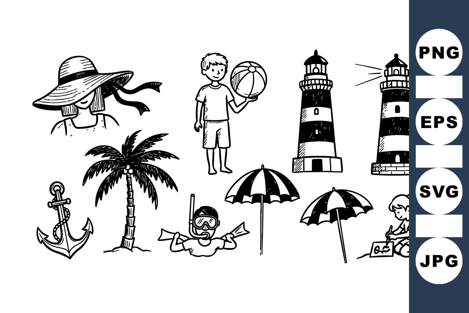 A set of black and white hand drawn vector beach elements including lighthouse, palm tree, anchor, boy holding ball, girl drawing, umbrellas, and snorkeler in playful style.