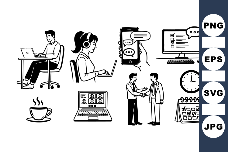 Remote work themed black and white line art showing people typing, virtual meetings, chatting on phone, coffee, clock, calendar, and business handshake scenes.