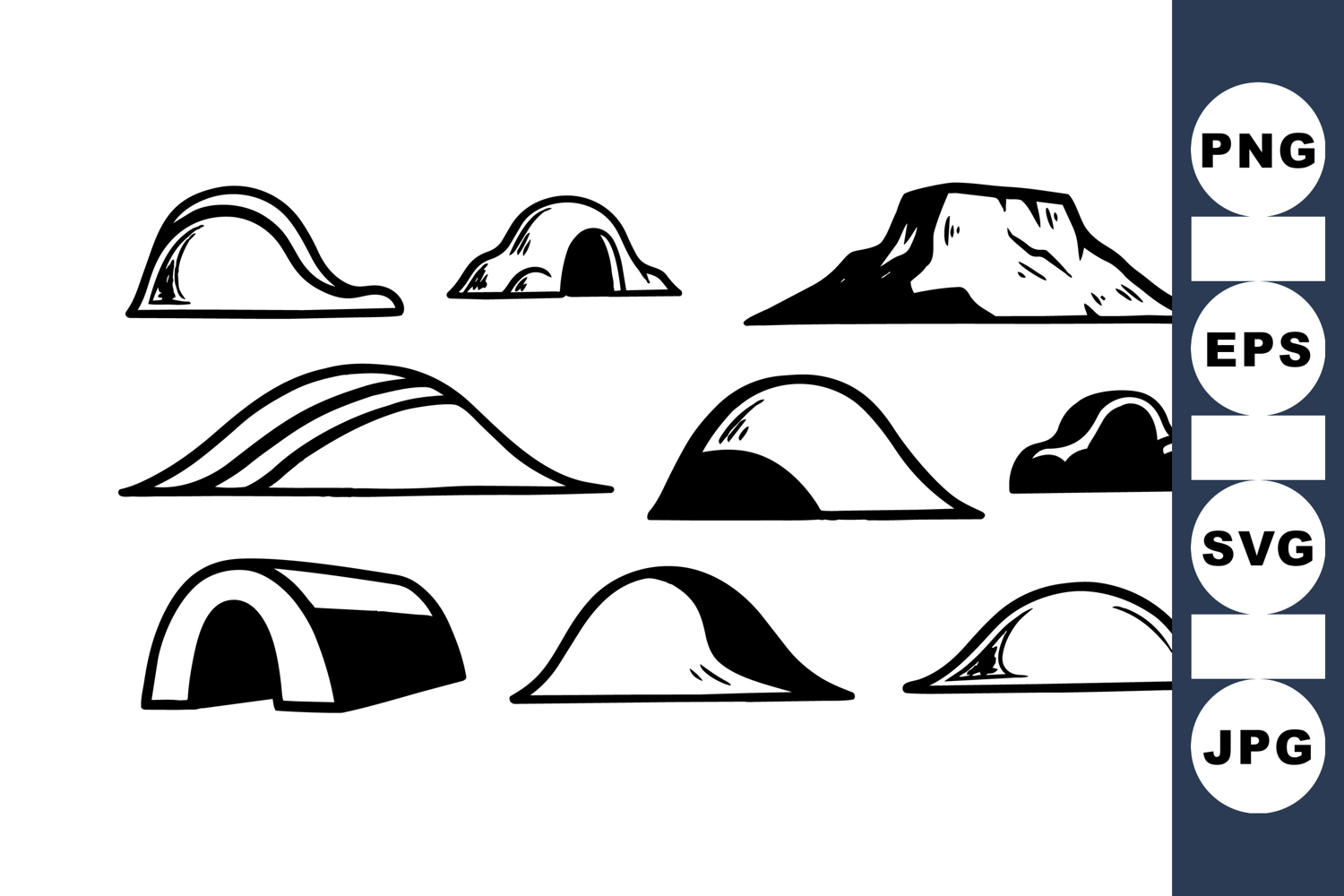Set of black and white vector drawings showing different shapes of small hills and mounds in minimal line art style for conceptual or educational uses.