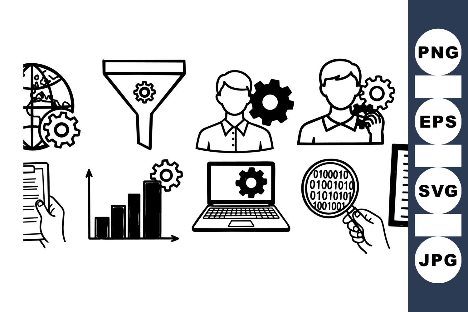 Simple black and white line art vector icons depicting data analysis, gear settings, laptop usage, user interaction, funnel processing, and code inspection tools in hand drawn style.