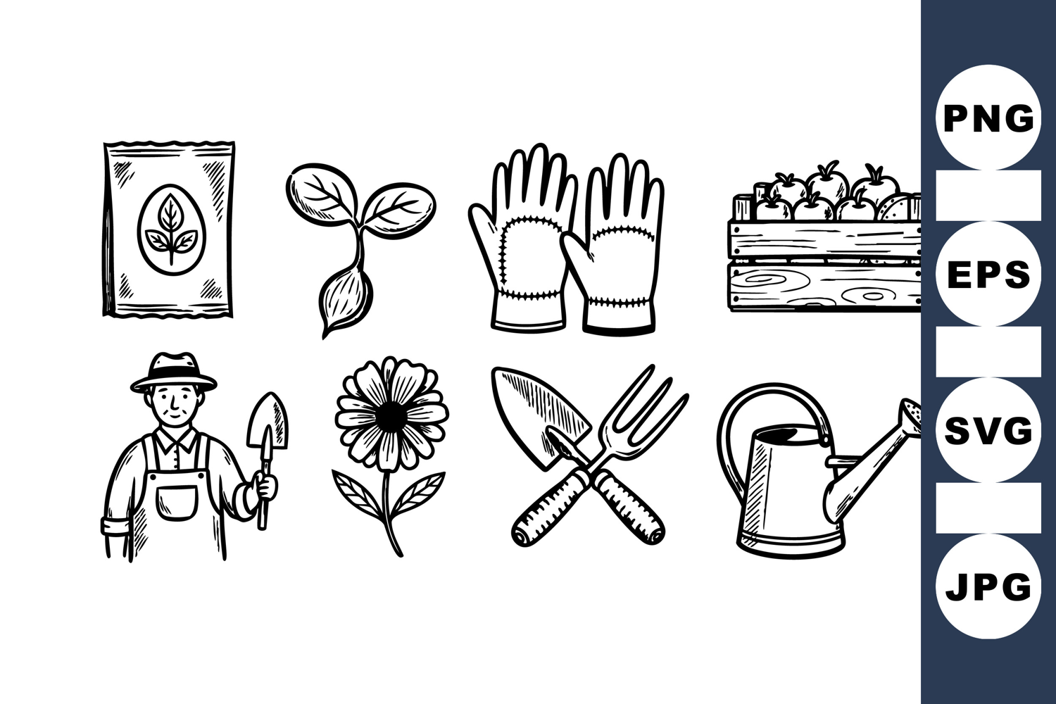 Black and white hand drawn vector of gardening tools, gloves, watering can, flower, seed packet, and gardener holding a trowel, depicting gardening activity icons in vintage style.
