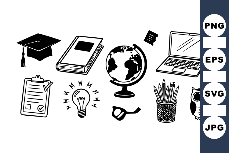 Hand Drawn Icons Graduation Cap Design Black White Icons Vector Education Icons Educational Icon Set School Supply Graphics Academic Clipart Bundle Study Themed Graphics Learning Project Pack Owl And Globe Set