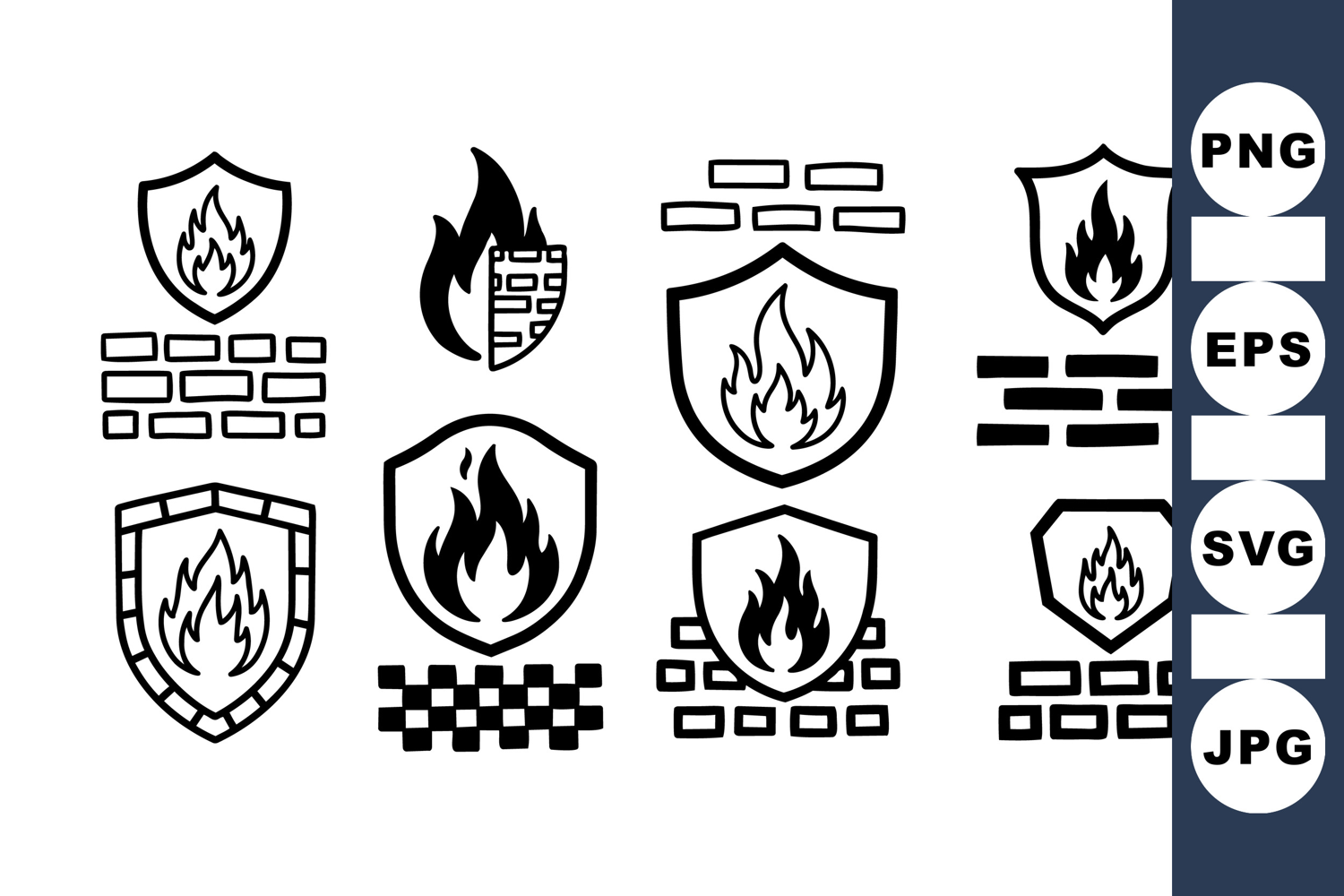 Brick Wall Design Vector Flame Icons Security Icon Set Black Line Icons Protection Symbol Pack Fire Safety Clipart Fire Shield Icons Hand Drawn Shields Defense Emblem Set Safety Graphic Bundle