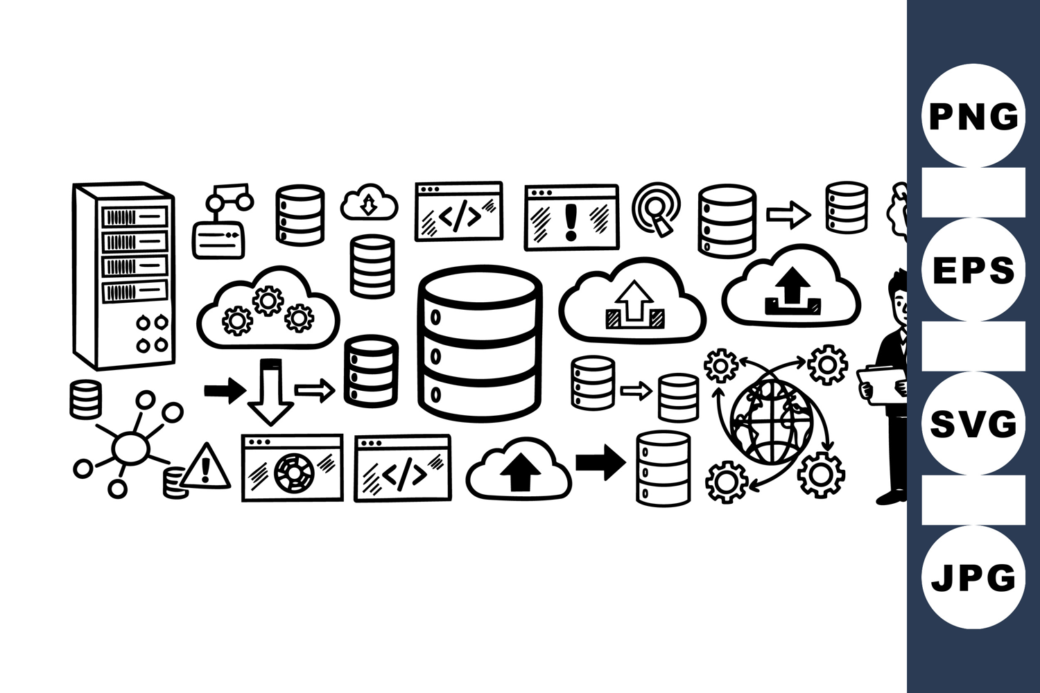 Vector outline style shows a professional businessman overseeing data flow between servers, cloud storage, and global data synchronization in a technical setting.