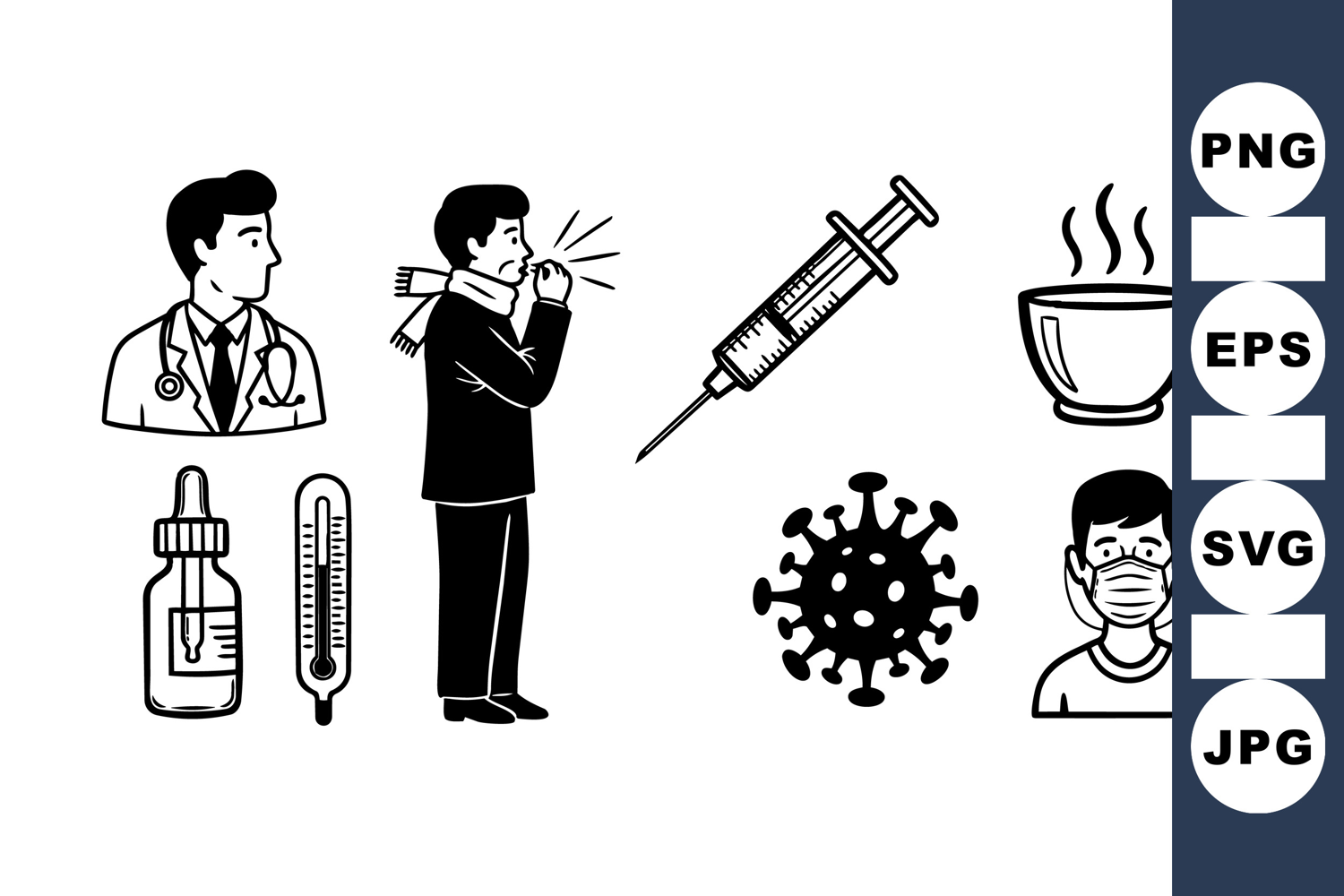 A set of medical and health related black and white icons including a male doctor, coughing man with scarf, syringe, virus, steaming cup, and person wearing a mask, displayed in vector style for educational or healthcare contexts.