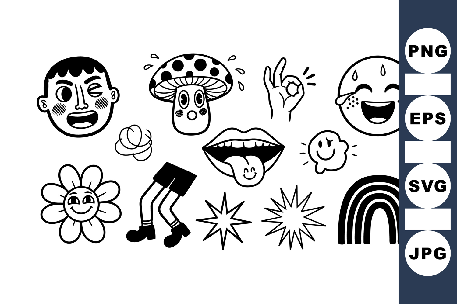 Playful black and white line art vector features assorted cartoon icons including smiling faces, mushroom, flower, legs, hand gesture, and tongue out expression illustration.