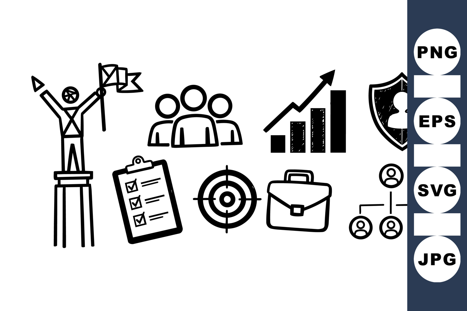 A set of hand drawn business and management icons featuring leadership, teamwork, growth, security, organization, and planning in a casual doodle style for presentations and reports.